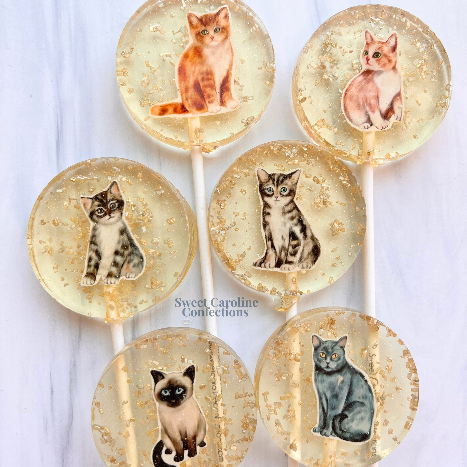 Indulge your sweet tooth with the Cat Collection Lollipops by Sweet Caroline Confections, featuring adorable cat designs encased in clear sparkle candy with gold edible accents. Enjoy the delightful peach flavor in each lollipop.