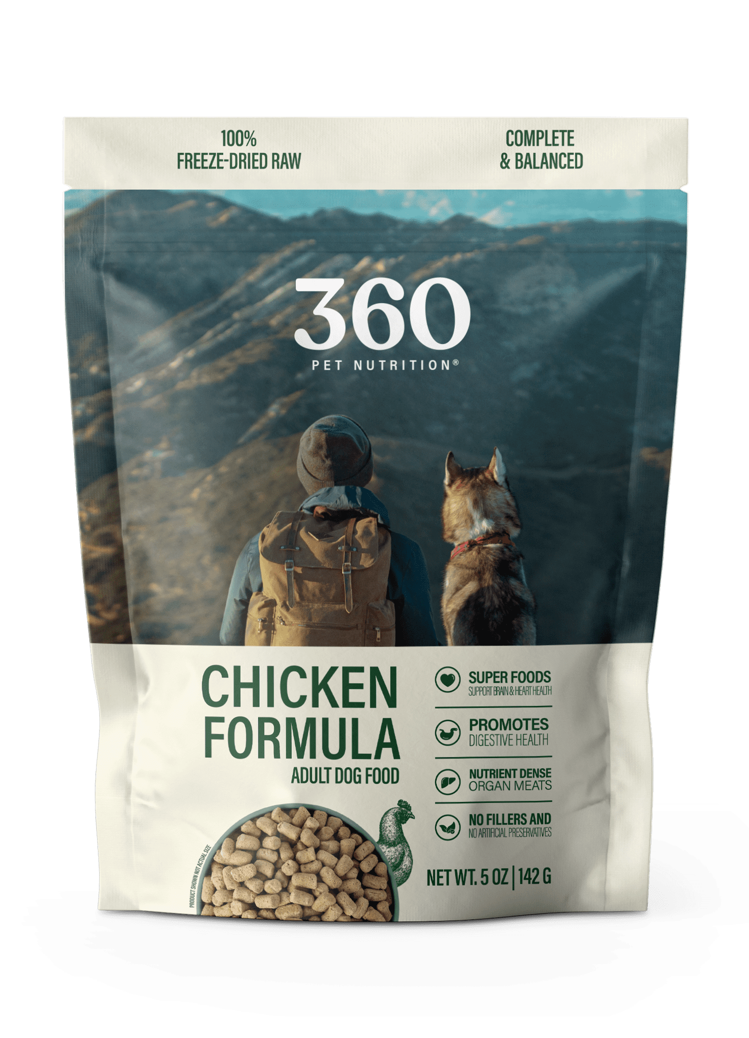 The 360 Pet Nutrition Chicken Flavor Freeze Dried Dog Food, 5 oz. Bag, offers a convenient and nutritious option for your pet's diet. This freeze-dried dog food is crafted to preserve the natural flavors and nutrients of chicken, providing your dog with a delicious and healthy meal option.