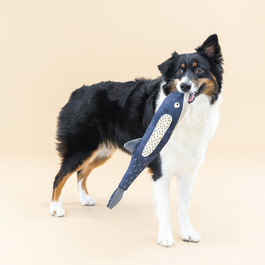 The 'There She Blows' dog toy from PetShop by Fringe Studio is designed to provide your furry friend with endless fun. Crafted from durable cotton canvas, this toy is equipped with a super loud squeaker and crazy crinkle paper to engage your pet's senses during playtime. The toy's modern design, printed with water-based and non-toxic ink, ensures it complements any home décor.