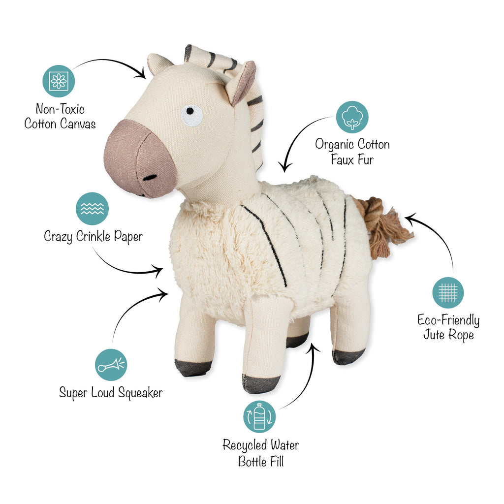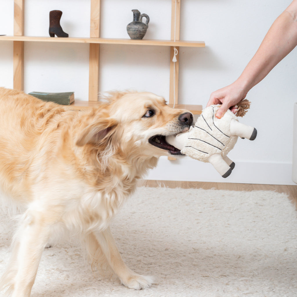 The 'Earned My Stripes' dog toy by PetShop from Fringe Studio is crafted for both fun and sustainability. Made with non-toxic canvas and filled with spun recycled water bottles, this toy is perfect for interactive play.
