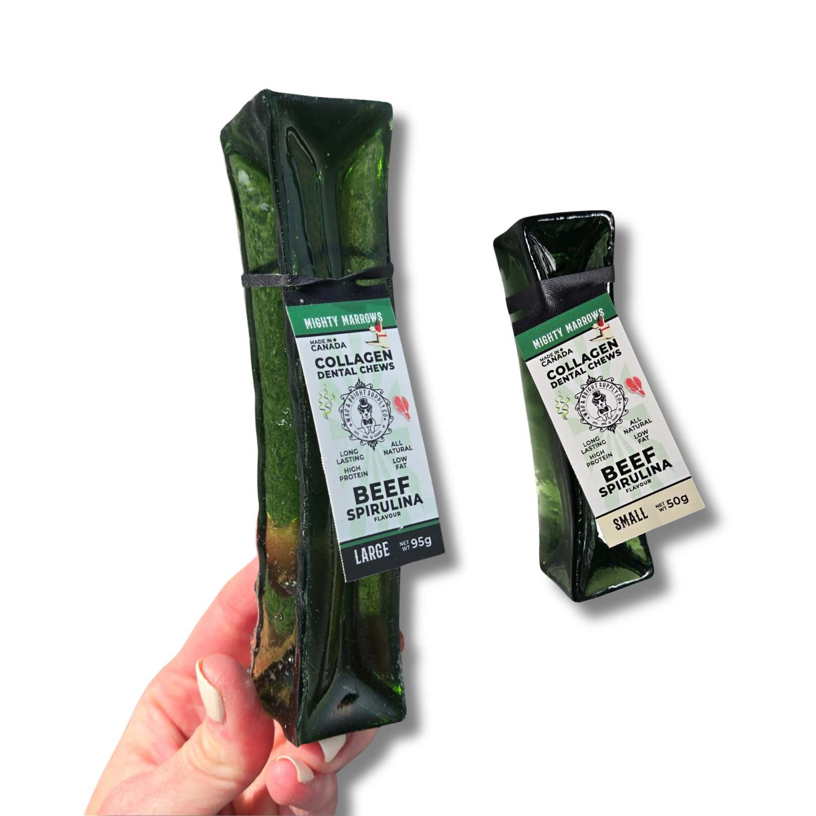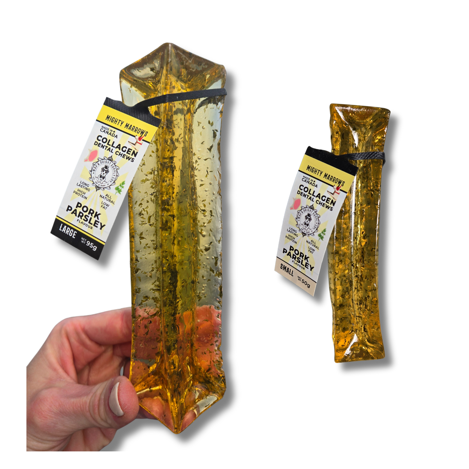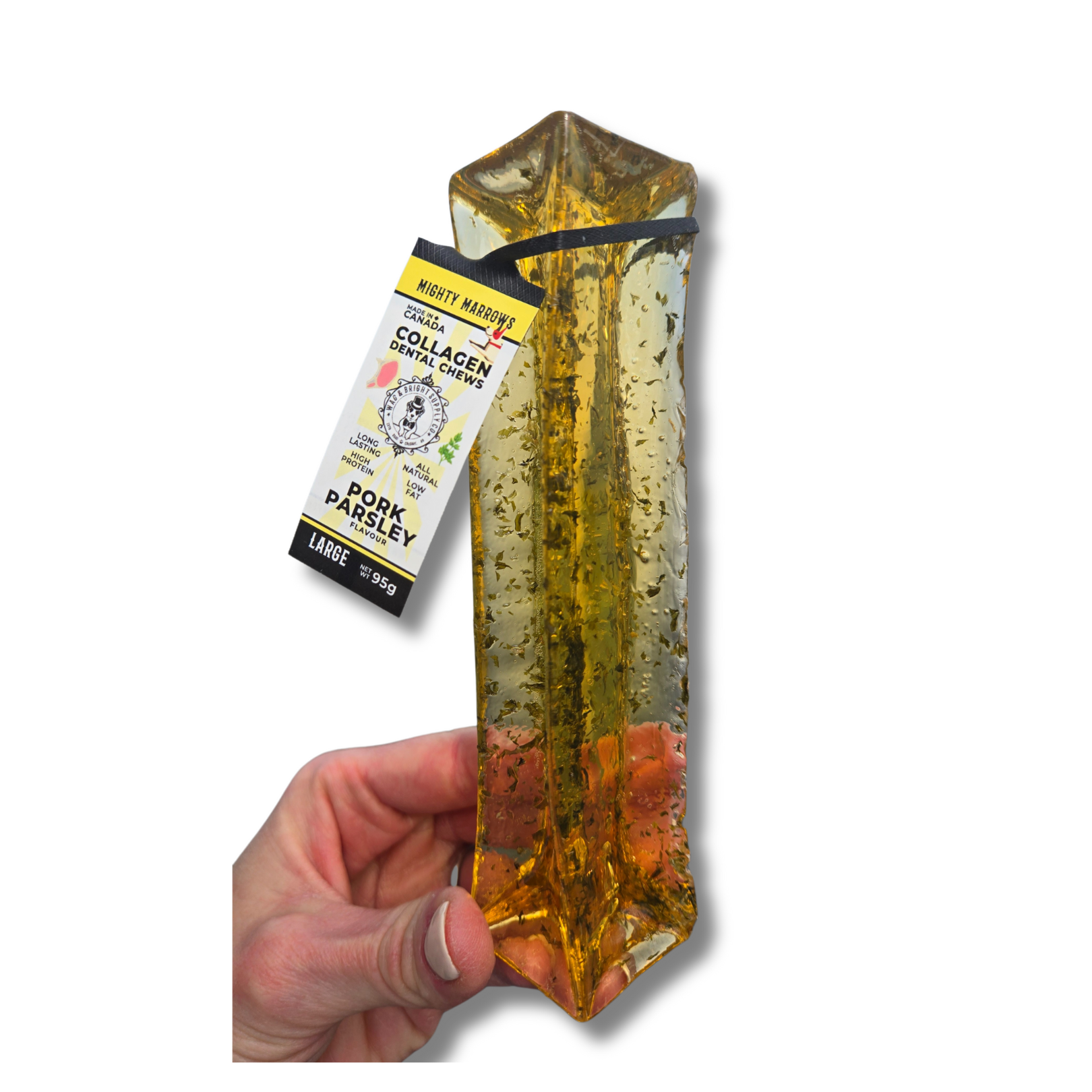Enhance your dog's oral health with Mighty Marrows Collagen Dental Chews. These chews are designed to naturally clean teeth and freshen breath while being gentle on your dog's mouth. Made with high-quality ingredients, they offer a nutritious and delicious way to support dental hygiene.