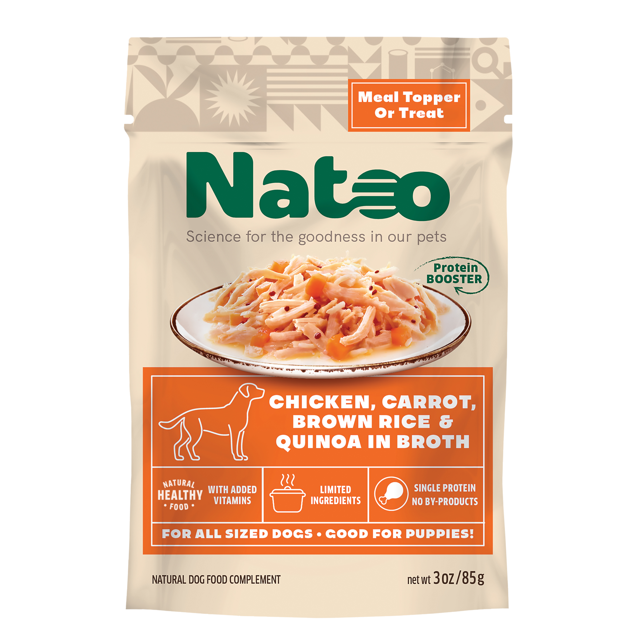 Natoo Chicken, Carrot, Brown Rice, and Quinoa in broth is a nutritious meal topper designed to enhance your dog's diet with wholesome ingredients. Suitable for dogs of all sizes and ages, this vitamin-fortified recipe with its savory broth is sure to satisfy.