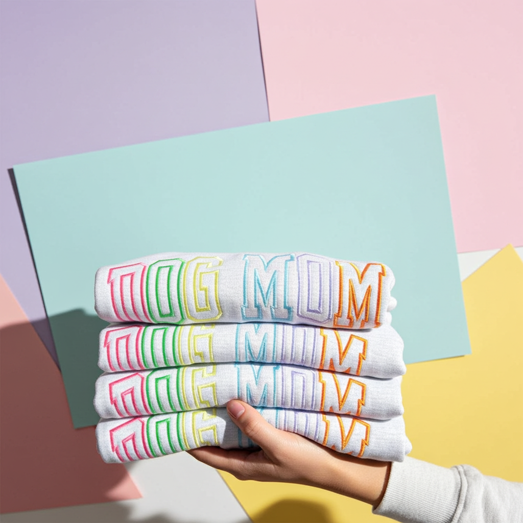 Show off your love for your furry friend with the Dog Mom Multi Color Varsity Embroidered Sweatshirt. This comfortable and stylish sweatshirt features vibrant embroidered lettering that makes it a standout piece in any wardrobe.