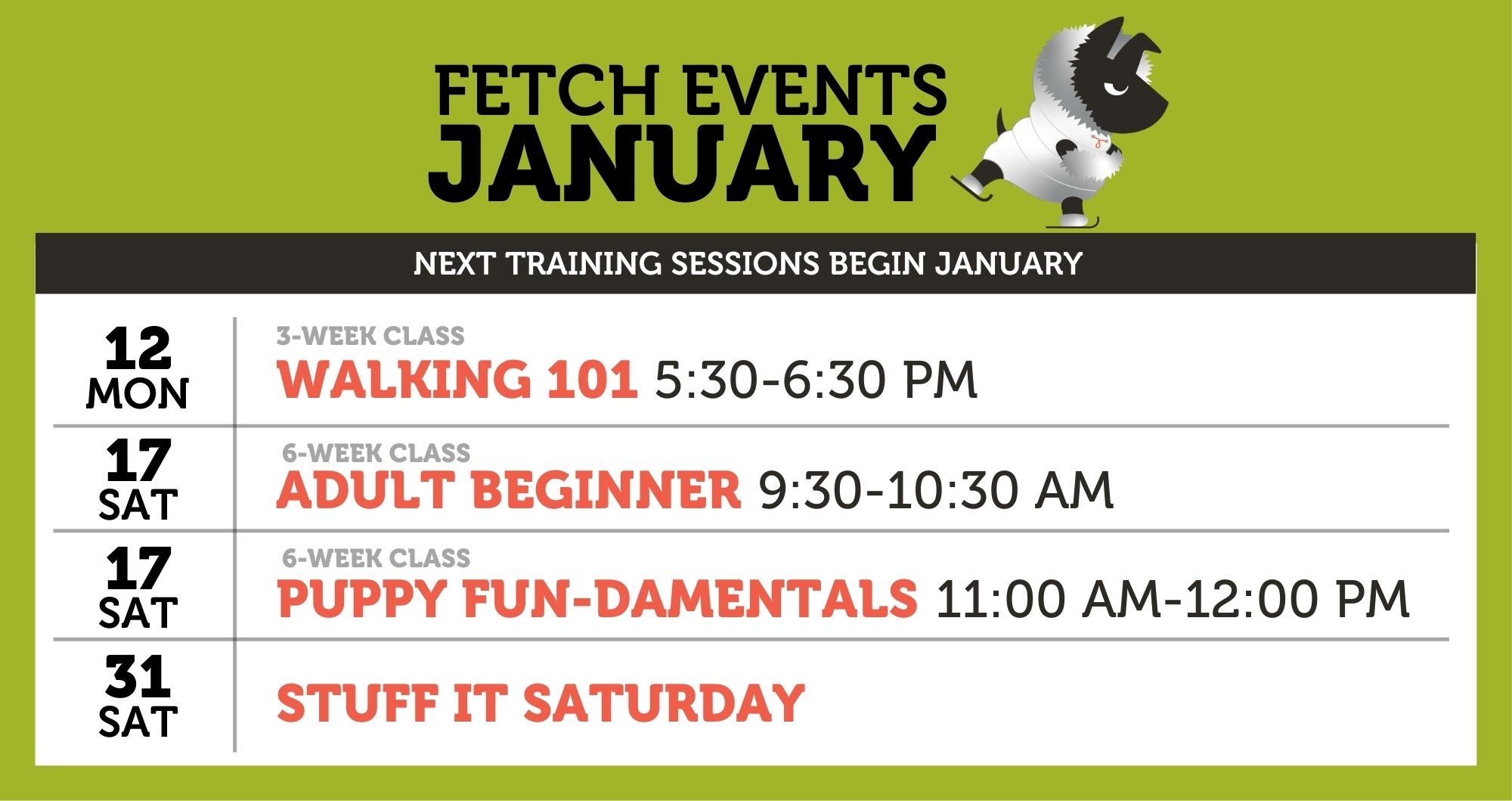 TRAINING SESSIONS New training sessions start throughout the month. Dates and times vary, please check our monthly calendar.