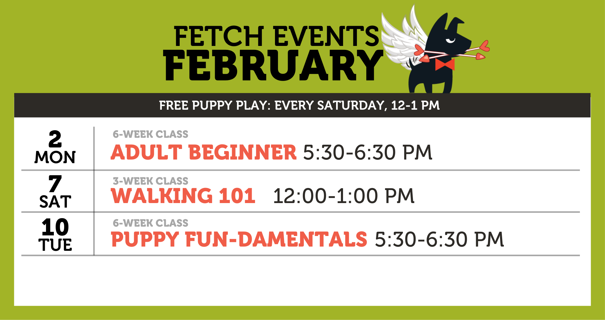 FREE PUPPY PLAY Saturday's from 12:00-1:00 p.m. Dates vary, please check our monthly calendar.