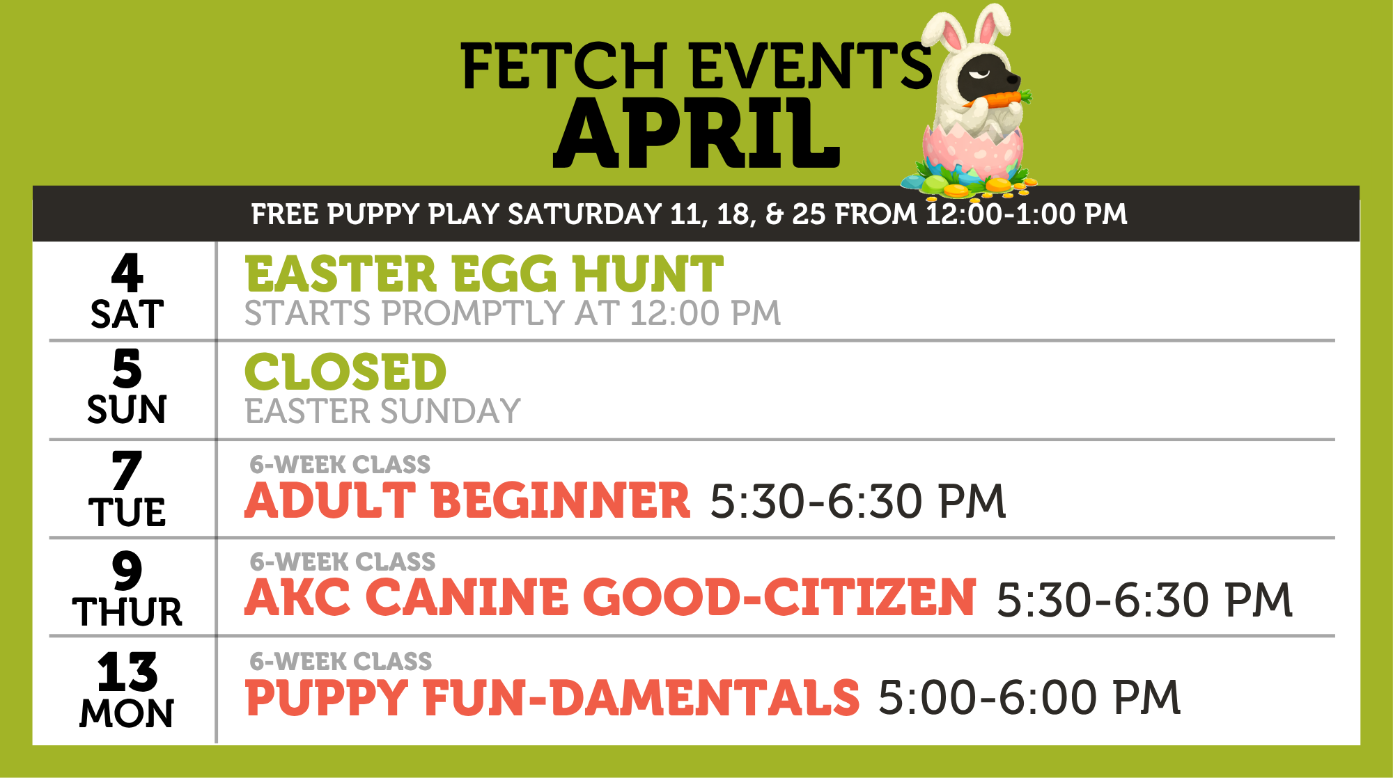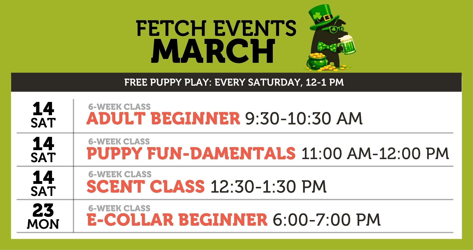 FREE PUPPY PLAY Saturday's from 12:00-1:00 p.m. Dates vary, please check our monthly calendar.