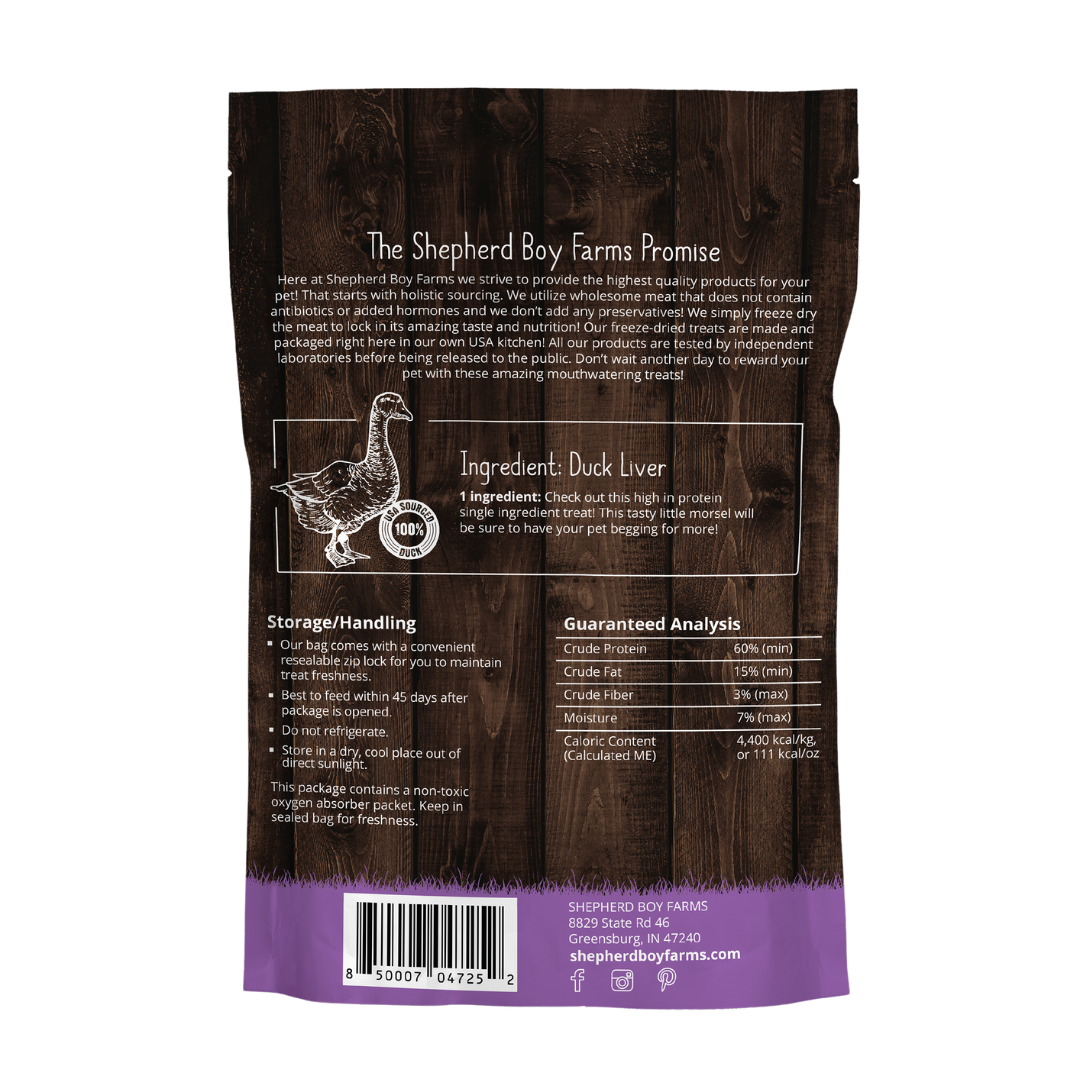 Indulge your pet with Shepherd Boys Farms' Freeze-Dried Duck Liver, a nutritious, single-ingredient treat. This high-protein snack is perfect for pets with sensitivities, providing essential nutrients like iron and B vitamins.
