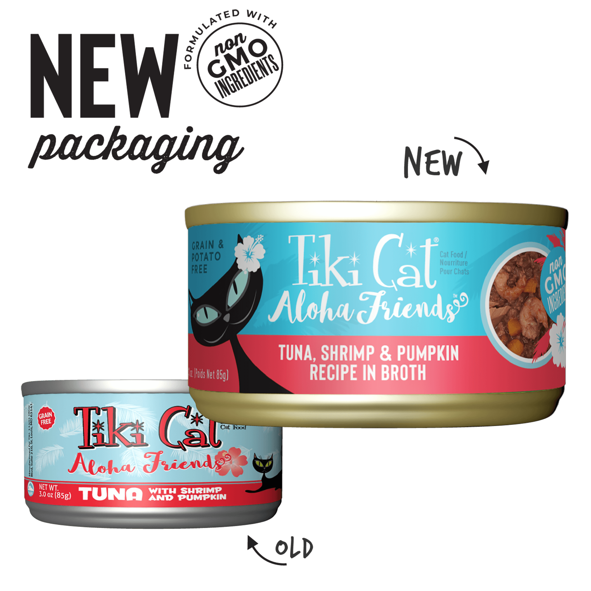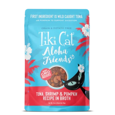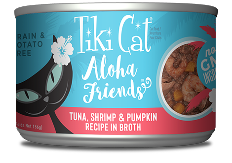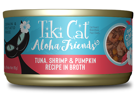 Tiki Cat Aloha Friends Tuna with Shrimp and Pumpkin is a high-quality, grain-free cat food designed to keep your feline excited for every meal. Packed with protein, this gentle formula is easy on your cat's stomach while providing essential nutrients.
