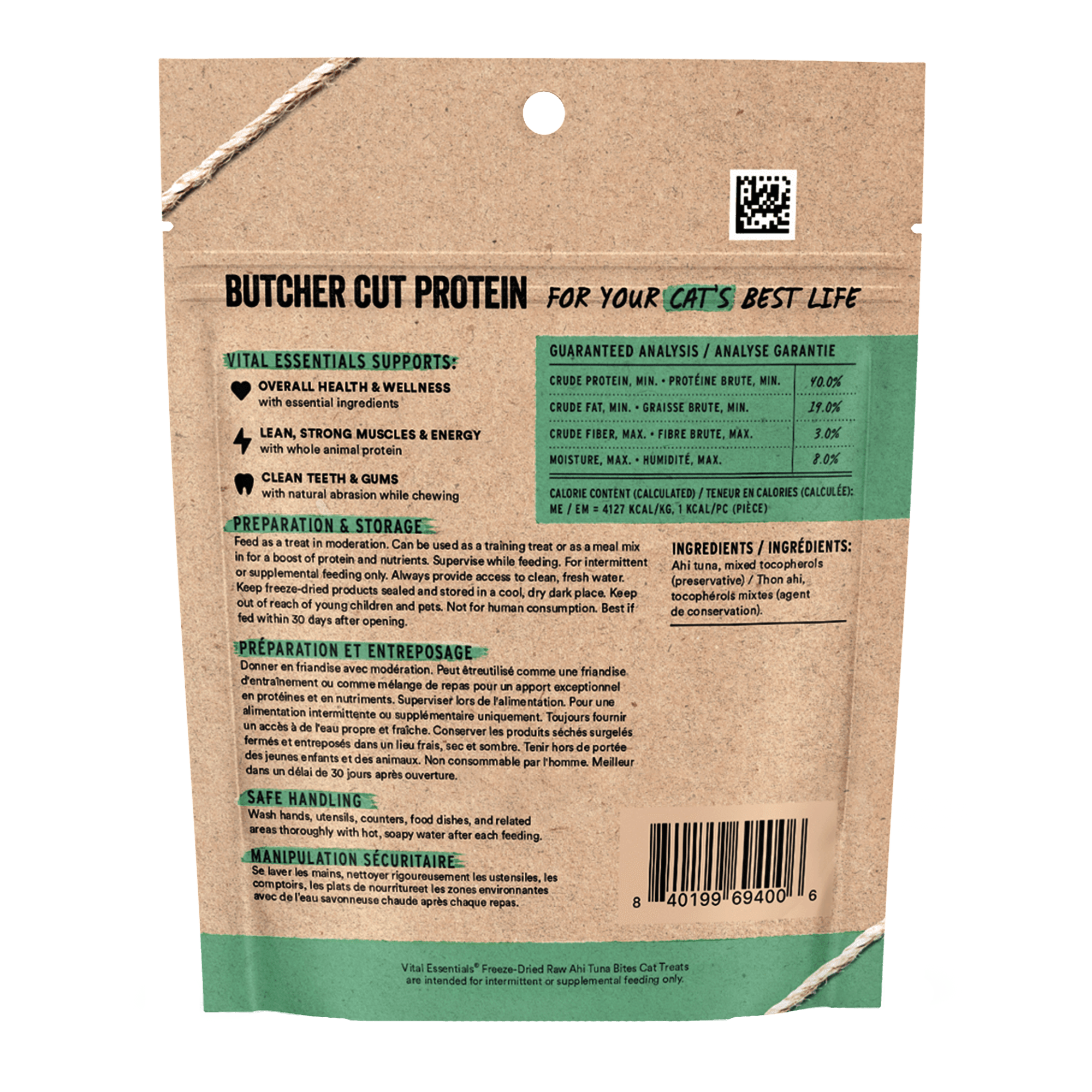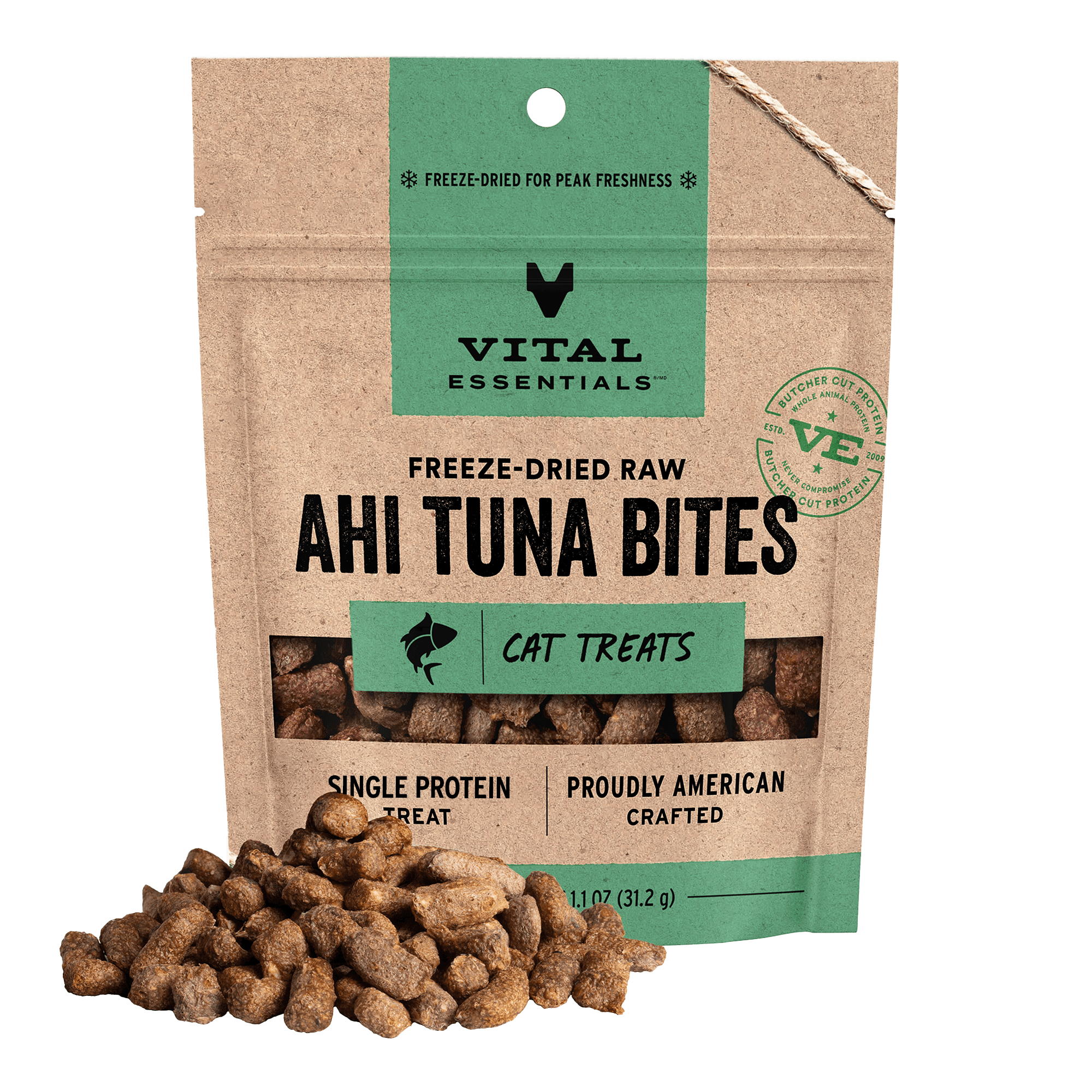 Indulge your feline friend with Vital Essentials Freeze-Dried Ahi Tuna Bites, packed with whole animal butcher cut protein for optimal health.